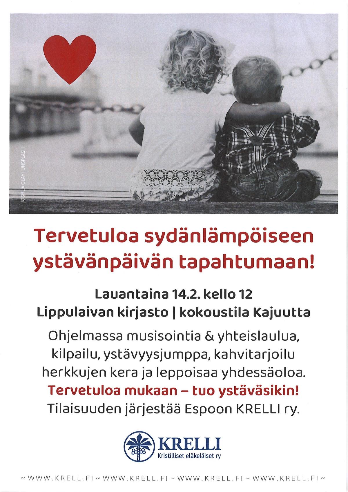 Tervetuloa sydänlämpöiseen ystävänpäivätapahtumaan Lippulaivan kirjastoon, lauantaina 14.2. klo 12.00. Luvassa mieltä nostattavaa ohjelmaa iloisessa ilmapiirissä! Tilaisuuden järjestää Espoon KRELLI ry.