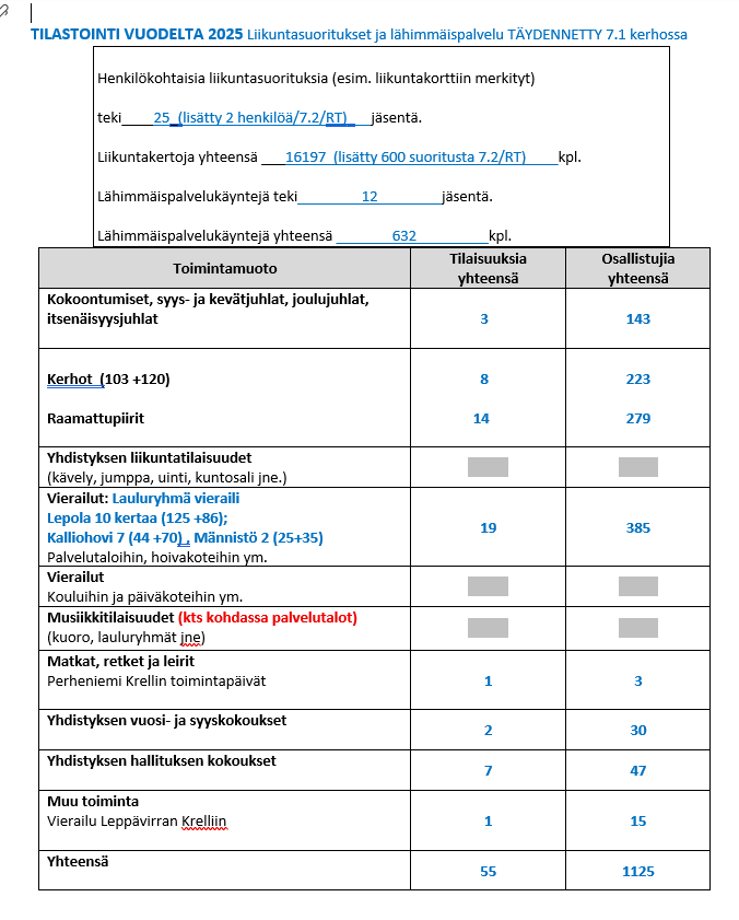 LIITE: Tilastollinen kooste Kuopion Kristilliset eläkeläiset ry:n toiminnasta toimintavuonna 2025