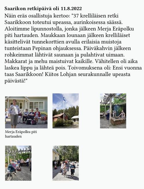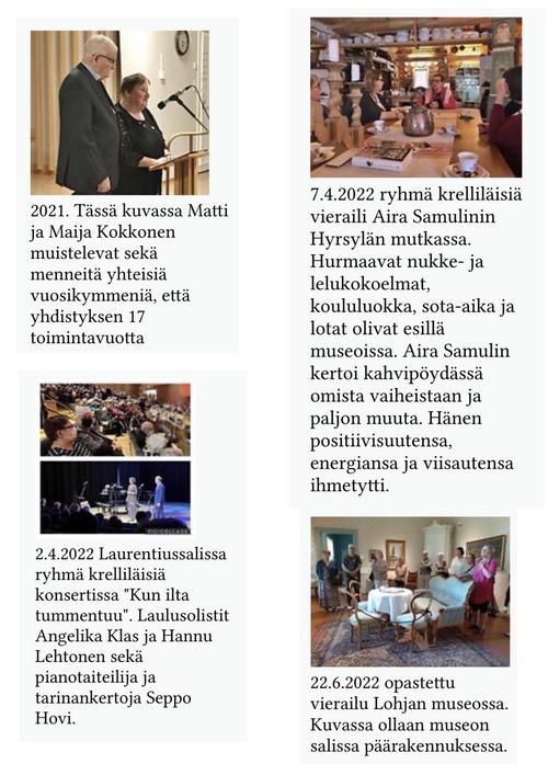 Galleria 2:n ensimmäinen kuva on kooste Uudenmaan piirin juhlasta 17.3.2023. Toisessa kuvassa esimerkkejä toiminnastamme vanhoilta sivuilta poimittuna. Kolmas on kuvakooste Saarikosta, Lohjan seurakunnan kesäpaikasta. Neljäs on KRELLIn kevätjuhlasta 2023. Viidentenä kuvana galleriassa on Ari Mönttisen pitämä tietoisku Länsi-Uudenmaan hyvinvointialueen asioista. Sitten on kuvia Lohja700 -juhlavuoden tilaisuuksista 2023 lokakuussa. Retkikuvat Tampereelta elokuulta 2024. Syksyllä 2024 yhdistyksemme jäsenet osallistuivat useisiin kulttuuritapahtumiin Lohjalla.