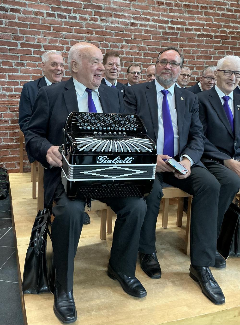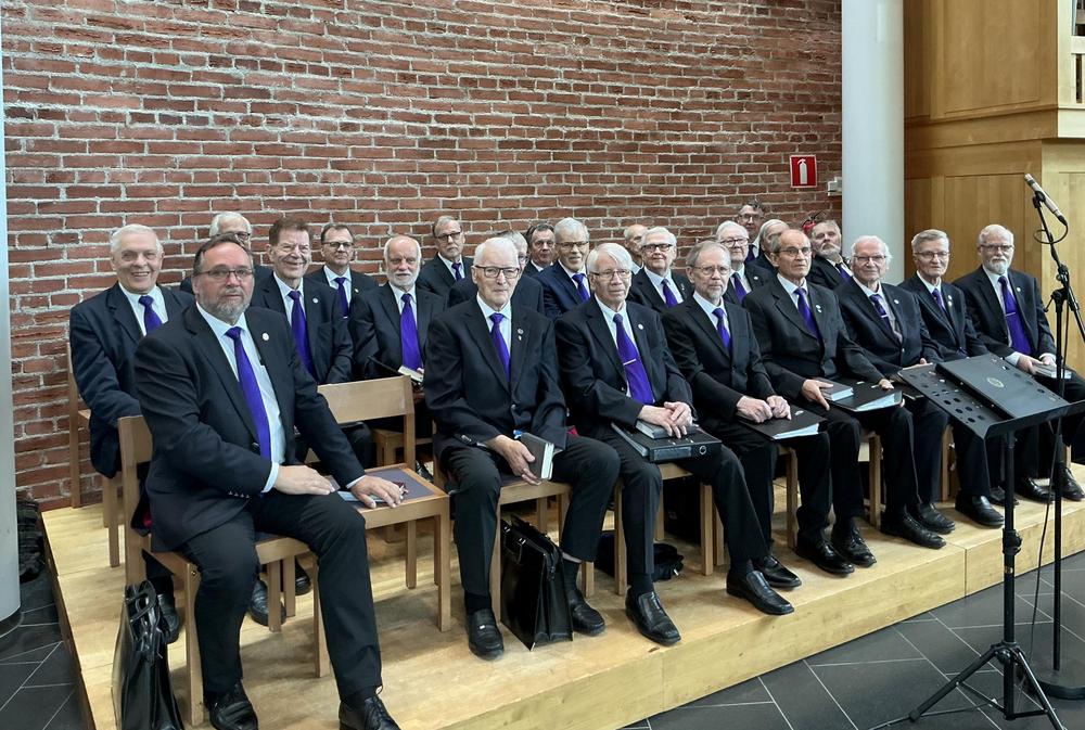 Kuvassa Ikinuorten puheenjohtaja Keijo Kantonen, aiempi pitkäaikainen puheenjohtaja Tuula Kivimäki ja Viestiveljistä Tauno Vesterinen ja Jarmo Ojanperä. Kuvissa näkyy myös Viestiveljien kuoro. Kuvat Urpo Vuorenoja.