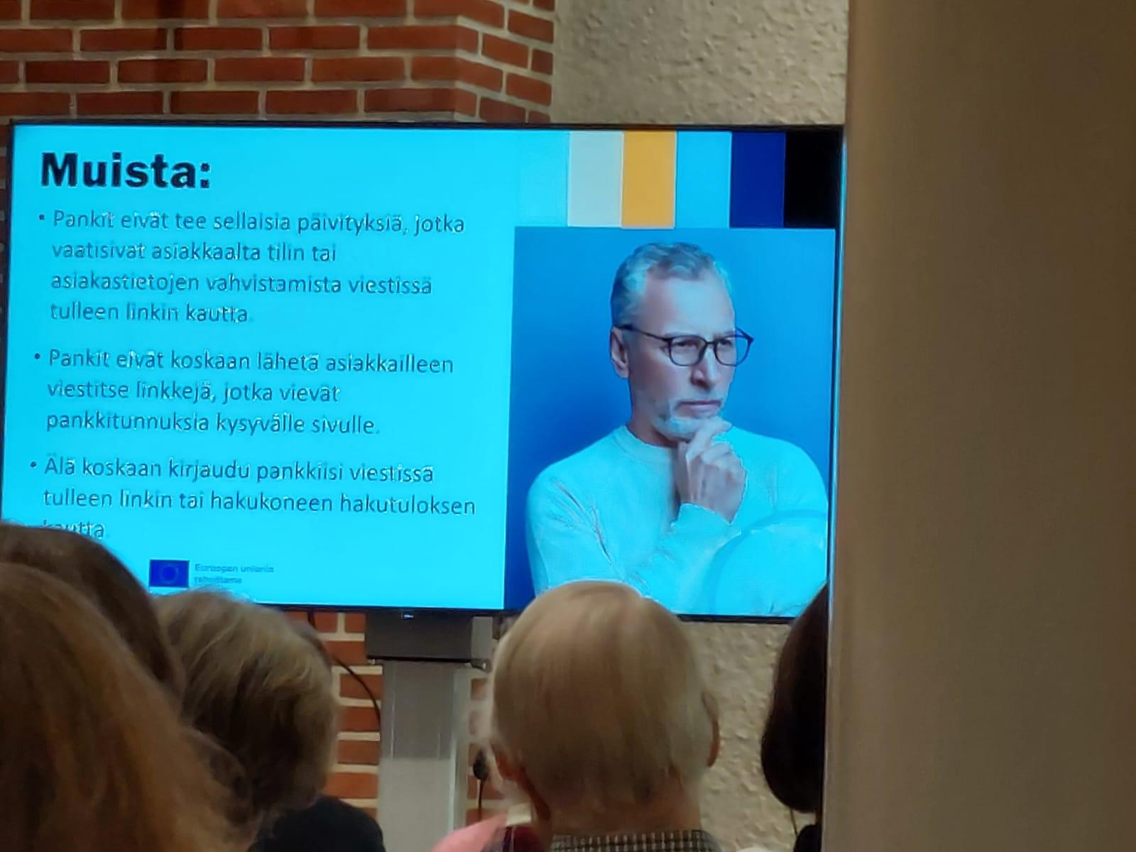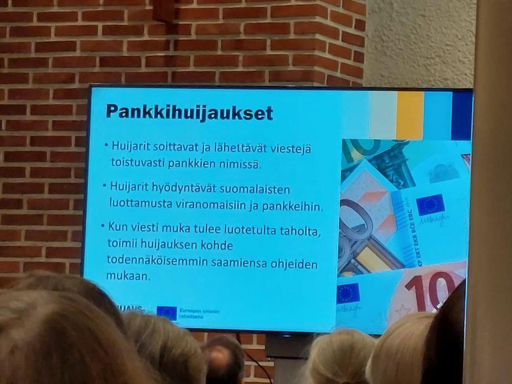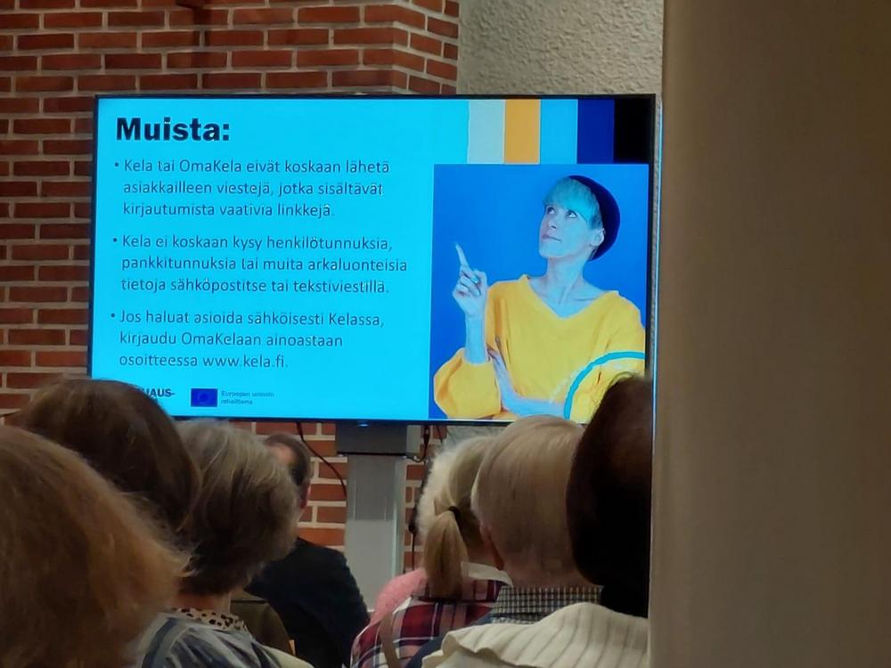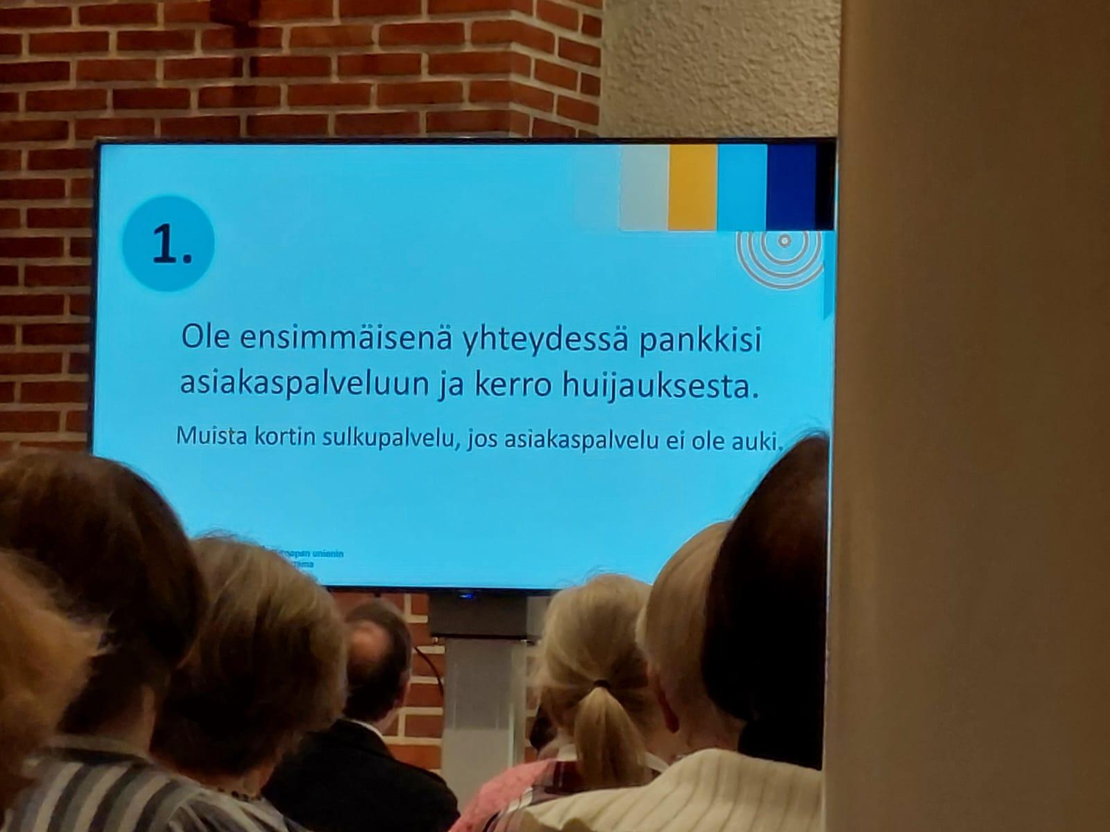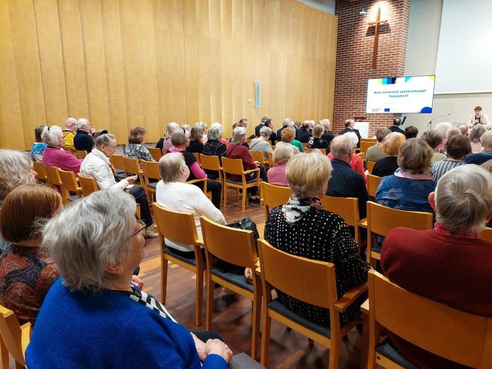 Valokuvia Ikinuorten kuukausitilaisuudesta 21.04.2026 Näsin salissa. . Puhujavieraana oli Kuluttajaliiton kouluttaja Ilo Bruun aiheella Ajankohtaiset huijaukset. Kuvat Leena Järvinen