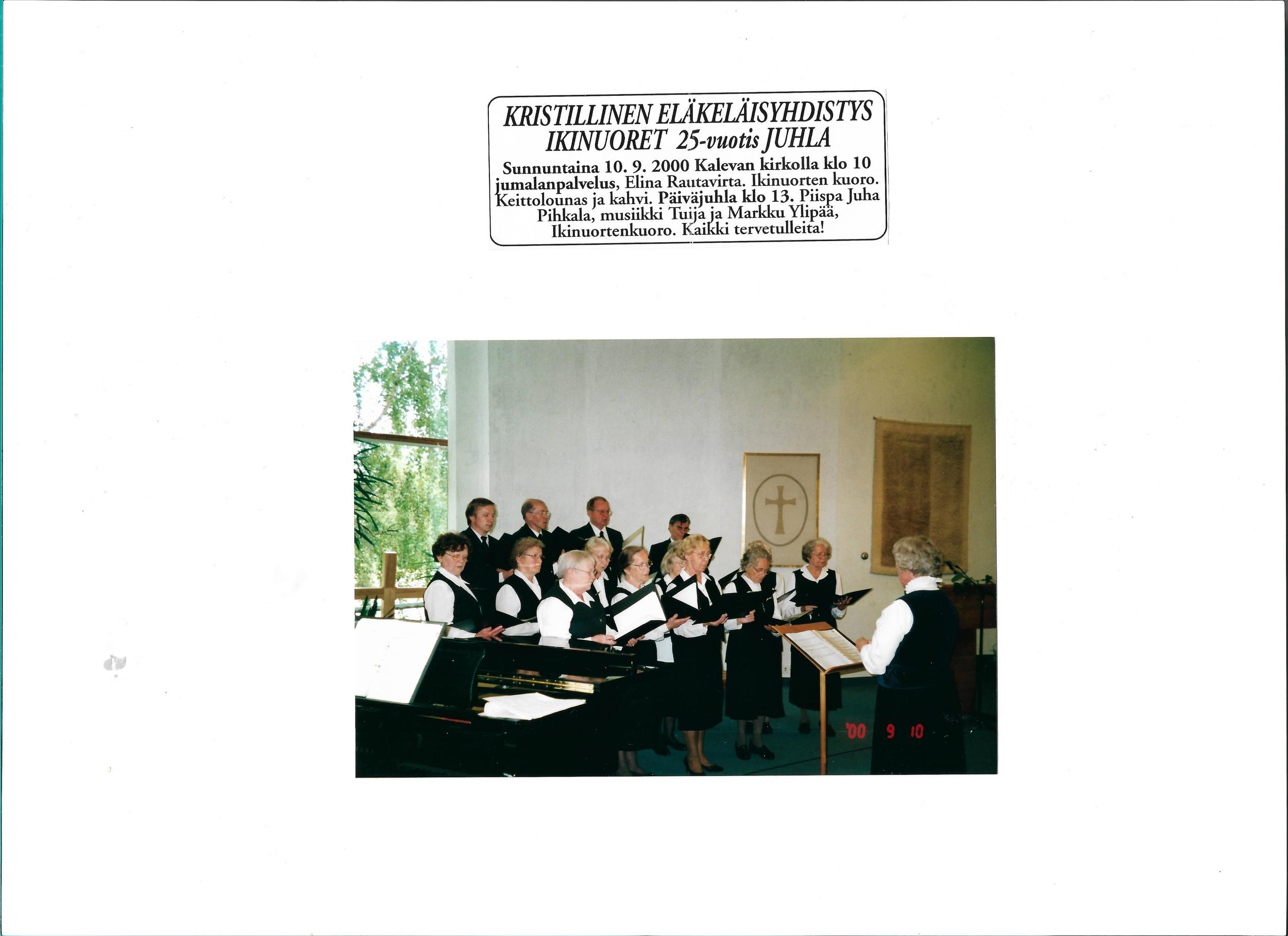 Aloitimme juhlamessulla Messukylän seurakunnan pastorin Jari Kuusen ja kanttori Miia Moilasen johdolla. Ehtoollisavustajina toimivat Terhi Hakala-Vappula, Marja-Liisa Kokkonen ja Pekka Luukkala. Ruokailun ja juhlakahvien jälkeen pääjuhlaa juonsi Krellin toiminnanjohtaja Päivi Kyyrö. Ikinuorten kuoro lauloi Jarmo Ojanperän johtamana ja Leena Juppalan säestämän Ikinuorten laulun. Puheenjohtajamme Keijo Kantonen toivotti kaikki tervetulleeksi.