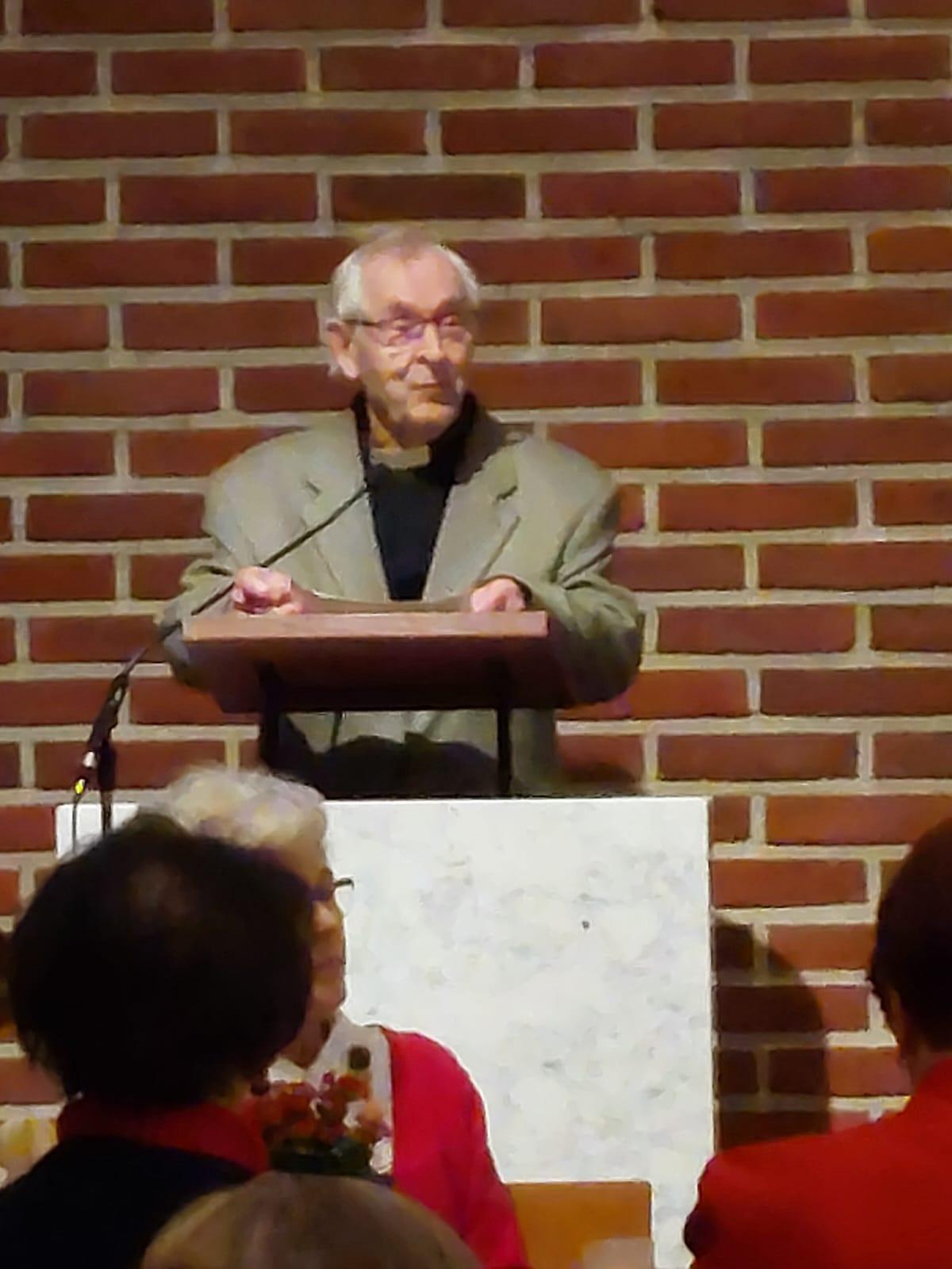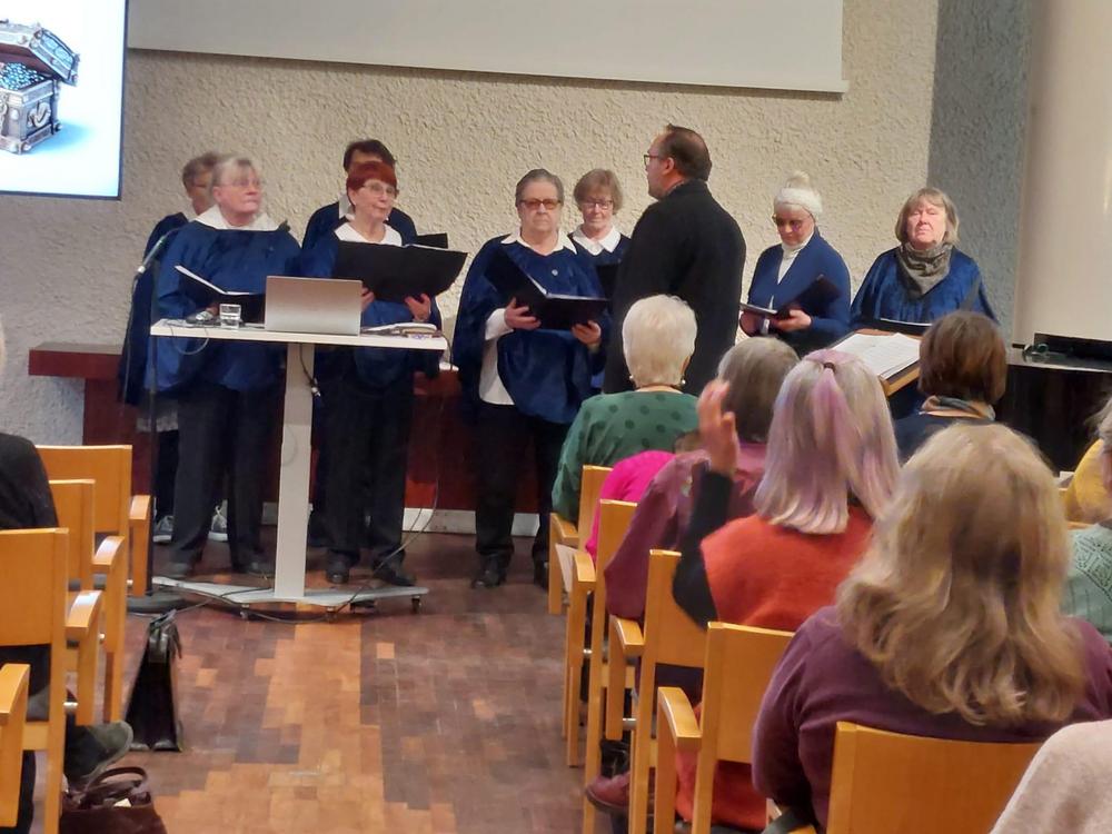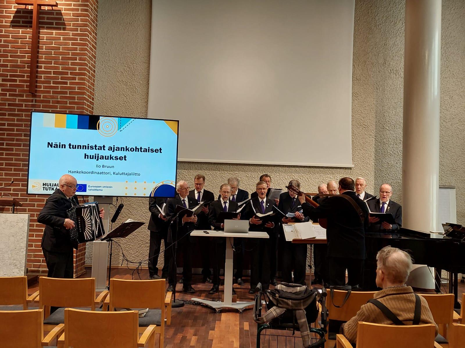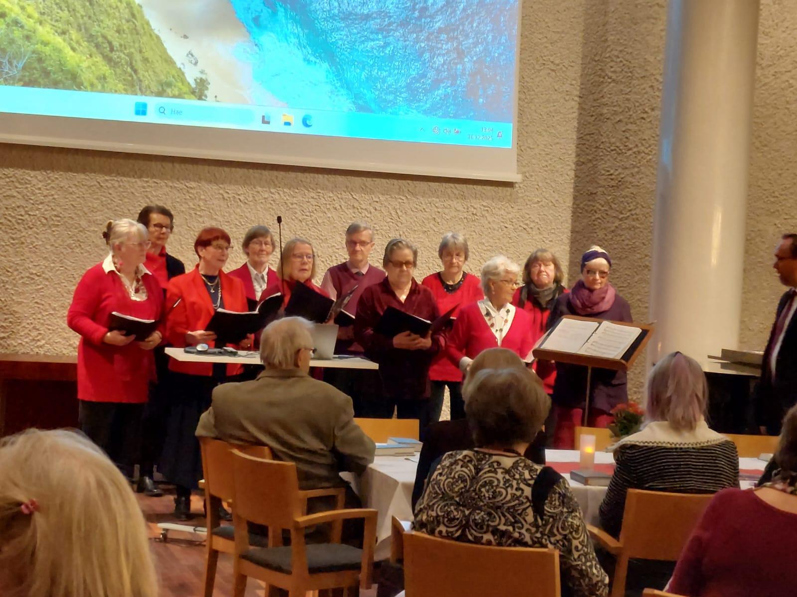 Osmo Lötjönen ja Mari Mattelmäki olivat Ikinuorten lokakuun 2025 kuukausitilaisuuden puhujavieraat. Jarmo Ojanperä johti Ikinuorten kuoroa. Kuvat Leena Järvinen.